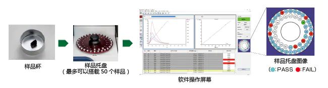 切下適量的樣品放在樣品杯內,將其置于樣品托盤上。之后進行簡單地軟件操作,利用自動進樣器開始進行自動測量。在軟件操作屏幕上顯示樣品圖像,可以隨時確認連續測量的進展情況和判定結果(OK/NG)。