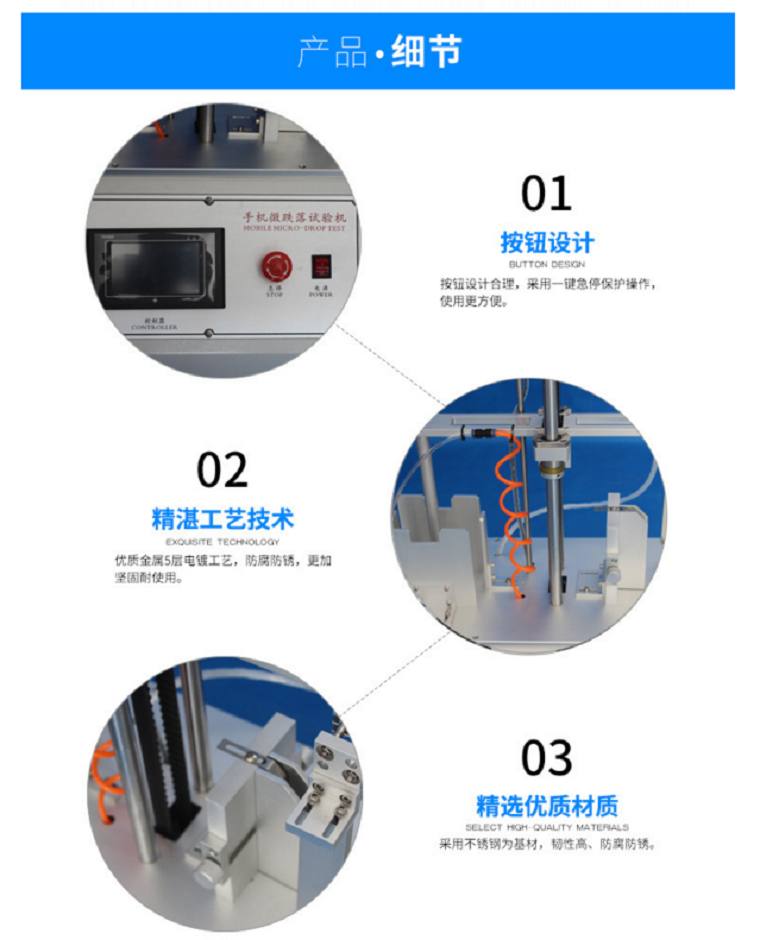 本機采用日本信濃電機作為手機提起、跌落驅動源,耐久使用;能實現手機等產品反復跌落,以檢測產品由一定高度落下之耐沖擊性;