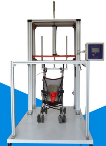 本機適用于手推式嬰兒車模擬超越障礙物時所作舉起下壓耐用性測試,測試方法為置模型嬰兒于車臺中,舉起時使車臺后輪離地區150mm,下壓時使車臺前輪離地150mm,以每分鐘15±1次,并持續往復測試3000次后,目視車臺有無損壞,達設定次數,并能自動停止操作。