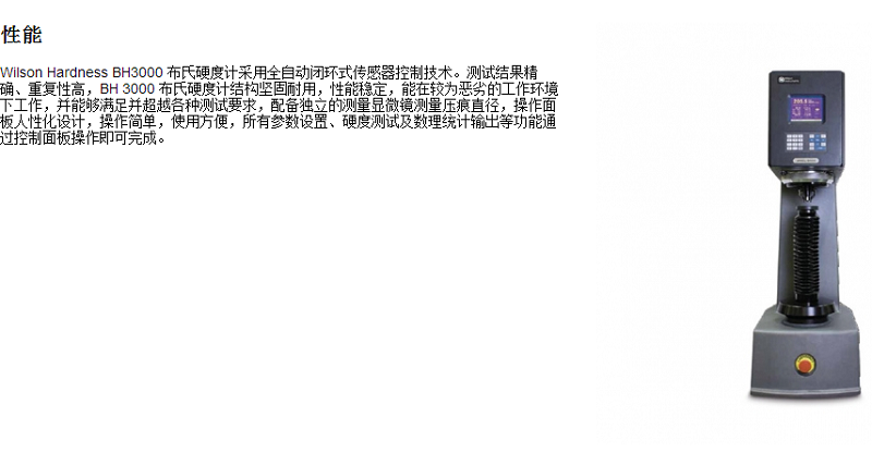 Wilson Hardness BH3000 布氏硬度計采用全自動閉環(huán)式傳感器控制技術(shù),測試結(jié)果精確、重復(fù)性高,結(jié)構(gòu)堅固耐用,性能穩(wěn)定,能在較為惡劣的工作環(huán)境下工作,并能夠滿并超越各種測試要求,配備獨立的測量顯微鏡測量壓痕直徑,操作面板人性化設(shè)計,操作簡單,使用方便,所有參數(shù)設(shè)置、硬度測試及數(shù)理統(tǒng)計輸出等功能通過控制面板操作即可完成。