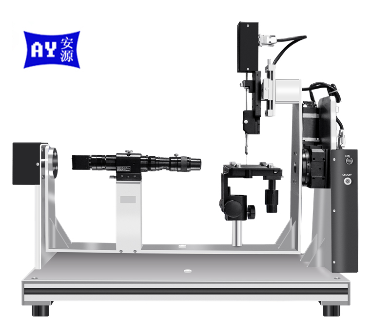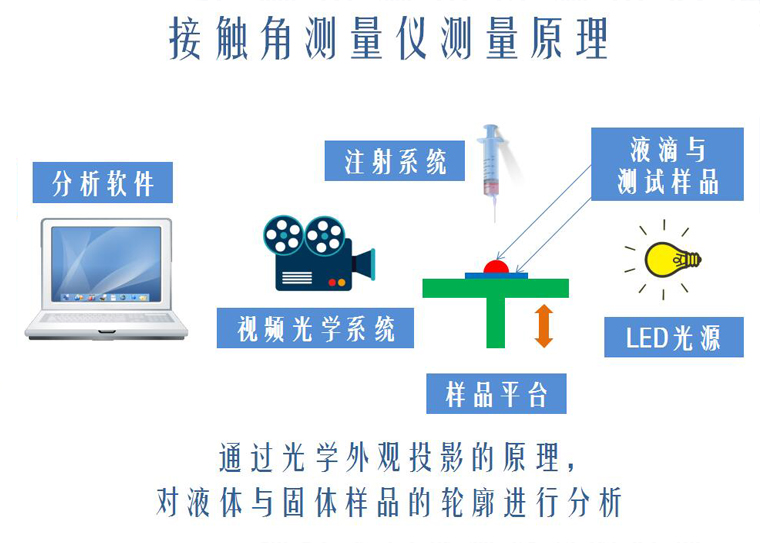 如上圖、按觸角測量儀主要由光源、注射單元、樣品臺、采集系統、整體傾斜平臺、分析